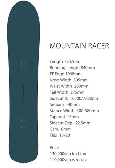 シモンズ的なスノーボードがこのモデルのコンセプト。Chris Christensonシェイプの「Ocean Racer」からネーミングのヒントを得て「MOUNTAIN RACER」と命名。テールワイズの張りを引っ掛け、ターンのきっかけにする様なスナップバックやサイズ以上に感じる初速の早さなど、ダイアモンドテールのクイックな動きと裏腹にあらゆる斜面に対応しオールラウンドに雪山を駆け巡る。