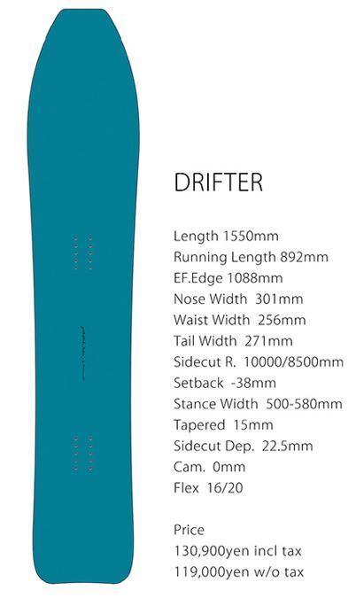 80年代前半に作られたモダンフリーライドのアウトラインイメージと玉井太朗のオリジナルボトムラインを融合させ、まさにクラシックモダン・ハイブリットDRIFTERが誕生した。THE SNOWSURFシリーズの中で最長レングス1550mm。ロングノーズの浮力バランスとフラットキャンバーのルース感、粘りのあるトーション、それらの絶妙なバランスにより生まれたクラシックな乗り心地のフリーライドボードだ。