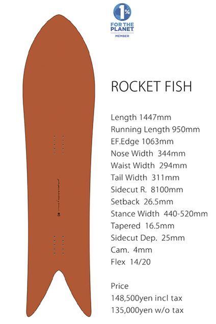 最大級のノーズ幅と浮力。超クイックな動きのショートレングス。バンブーストリンガーによる強い返り。深いスリットのしなやかなフィッシュテール。 超ショート&超ファットのアウトラインはどんなボードよりも深いカーヴを描き出し体感速度は途轍もなく速い。ダウンザラインの早い波に乗るイメージと重なるこの板のライディングイメージは、ゲレンデ横のバンク、ナチュラルパイプでは波の上と同じように泳ぎ回り、グルームランではスピードをロスしない、肘や顎が擦れるほどカーヴィングで山々を跳ね回る。SNOWSURFERのためのスノーサーフボード"ROCKET FISH"は超ショートボードデザインのマスターピースだ。
