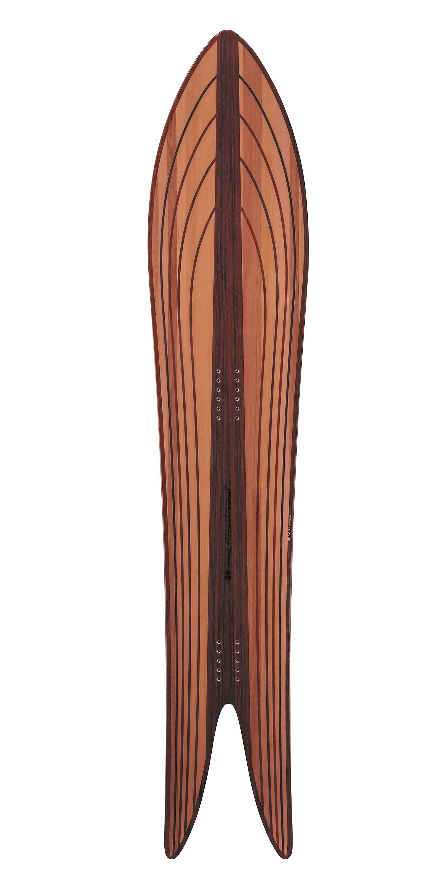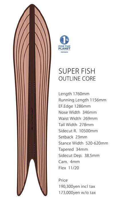 SUPER FISH OUTLINE COREは "SUPER FISH" より柔らかめの設定で良く撓りホールドする。ノーマルコアが反発重視の設定で、ロングボードでクルージングのイメージをするならこのアウトラインコアがおすすめだ。一見して大きなノーズとテーパーが特徴で、面積の広いノーズで浮力を得て、細めでしなやかなテールでコントロール性を高める。テールの浮力バランスを保つ為に、テール部は長めにデザインされ様々な機能がバランスよくまとまり、これ迄のこの手の板にありがちな現象の、パウダーでは乗れるがハードパックやゲレンデでは一切太刀打ち出来ないデザインとは一線を画しており、グルーミングバーンでも心地よいターンを可能にしてくれる。それこそがこのシリーズの最大の特徴だ。