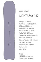 "MANTARAY"のDNAを引き継いだライトウエイト・ライダーのためのモデル。ミニマムなキャンバーとソフトなフレックスはただスケールダウンしただけの短いボードたちとは一線を画す。ライトウエイト・ライダー達に新たなカービング感覚を提供し、ツリーランではより自由なライン取りを可能とする。ボード性能によって上達に限界を感じていたライダーには是非オススメしたいボードだ。大人になる手前の子供や既存のボードを持て余し気味だった女性ライダーを新たな次元の滑りへと導いてくれるだろう。