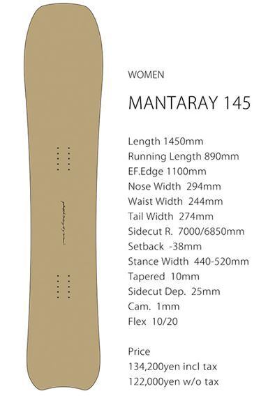 しなやかに仕上げることでコントロールを容易にしている。他のMANTARAYシリーズ同様にグルーミングからパウダーまでコンディションと地形を問わず、主に中低速域でのライディングにターゲットを合わせデザインされている。ライトウエイト向けMANTARAY142としっかりと張りのあるBABY MANTARAYのギャップを埋めるこのモデルは「このサイズが欲しかった」女性ライダー達の待望の1本だ。