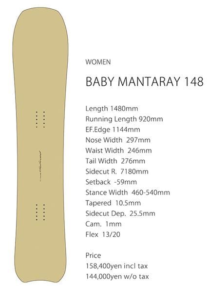 まるでどんな願いもかなうのではと思うほど。1mmのキャンバーにより自由でエロティックな動きに磨きがかかる。長年に渡り世界中のライトウエイトライダーを虜にしてきた往年のベストセラーであり世界のボードデザインに多大な影響を与えたマスターピース、それがBABY MANTARAY。