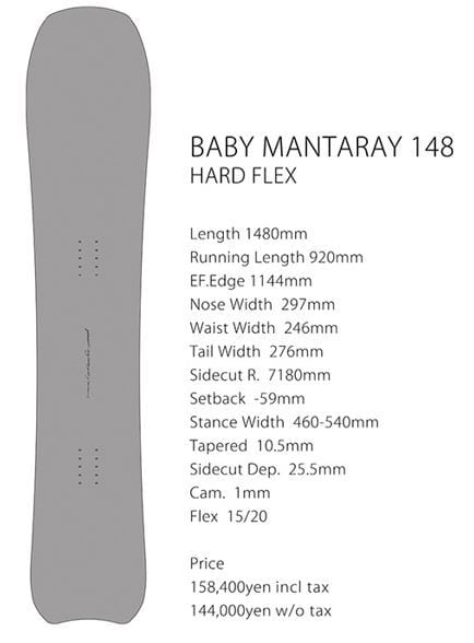 持っているだけで注目度満点なルックスと美しいロッカーライン。1mmのキャンバーにより自由でエロティックな動きに磨きがかかる。スピードクイーンや脚力に自信のあるレディースライダー、また、軽くてレスポンスの良いボードを好むライトウェイトのメンズライダーに向けて設定されたBABY MANTARAY HARDFLEX。1480mmとは思えないほど抜群の浮力。ディープパウダー、タイトなツリーラン、ゲレンデ横のピステンバンクと、どのような斜面やコンディションでも純粋に滑る楽しみを与えてくれるマジックボード。