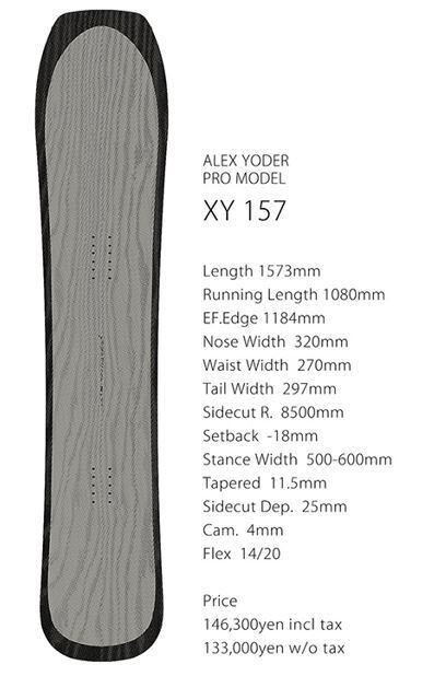 アレックス・ヨーダーが「XY・エックスワイ」に求めたものは、男性的な力強さと女性的な優雅さの融合。ディープなカービングを約束するワイズ、深雪にも急斜面にも対応できるレングス、ターンからターンへの繋がりをより自然で優しく感じられるサイドカーブ、そしてそれら全てを最大限に引き出すためのノーズとテールデザイン。悪魔に睨まれたとしても優しく微笑み返し、ハイスピードでもスムーズなグライドを約束し、山の曲線を優しく撫でるように滑り降りる。アレックスの理想のライディングを具現化するボード、それがXY。